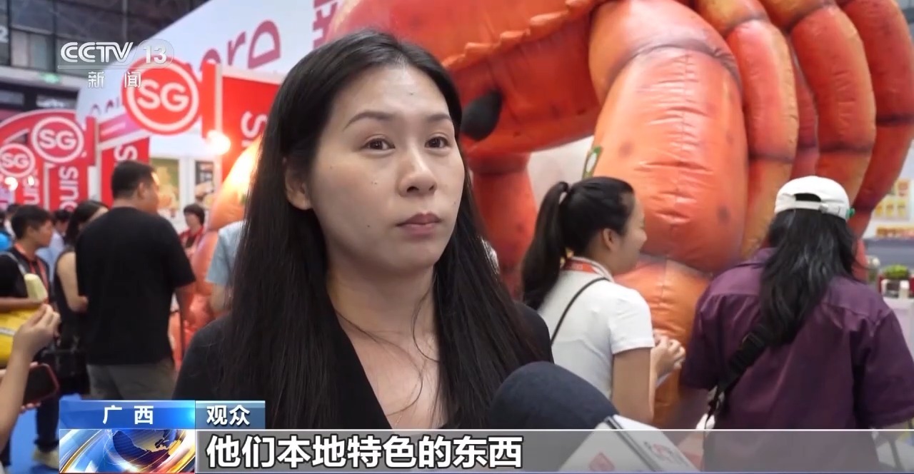 刚走进展馆,记者就发现,从马来西亚的榴莲雪糕、越南的咖啡豆,再到新加坡的各式玩具,在这里逛展就可以实现吃喝游乐购一体式的消费体验。一家排满顾客的展位展示的是来自新加坡的咖喱虾和咖喱蟹。