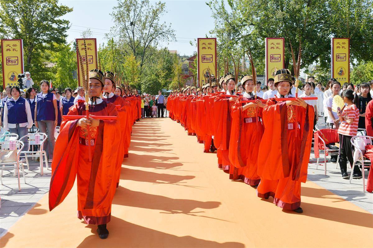 上午10时许,鼓声阵阵,庄重肃穆,祭孔大典仪正式开始。参祭人员列队而立,主祭人员依次向至圣先师孔子敬献花篮,六佾舞伴随表演,现场恭读祭文,最终完成祭孔仪式。据悉,祭孔大典主要包括乐、歌、舞、礼四种形式,有“闻乐知德,观舞澄心,识礼明仁,礼正乐垂,中和位育”之说。