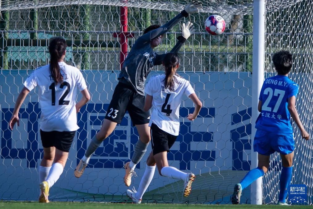 9月28日,武汉车谷江大队守门员丁旋(左二)在比赛中扑救。