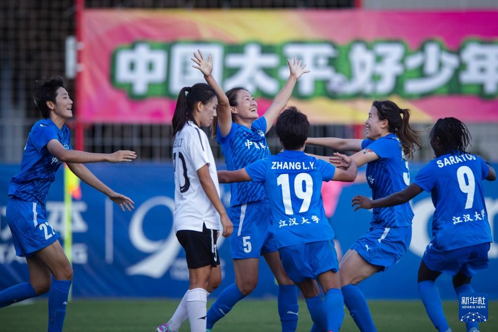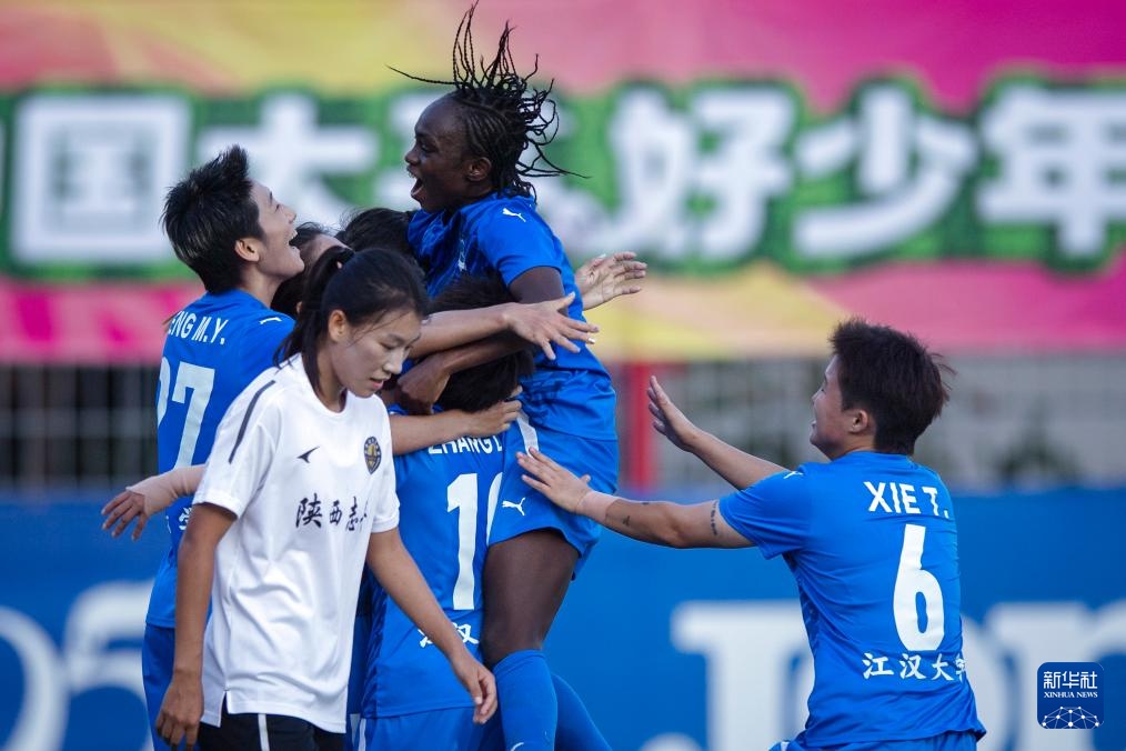 9月28日,武汉车谷江大队球员吴海燕(左三)进球后庆祝。