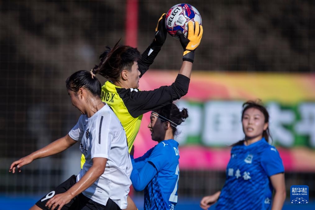 9月28日,陕西志丹队守门员朱梦迪(左二)在比赛中扑救。