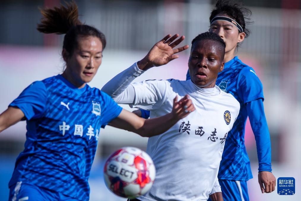 9月28日,陕西志丹队球员朱丽叶·伊莫·贝希(中)和武汉车谷江大队球员吴海燕(左)在比赛中拼抢。