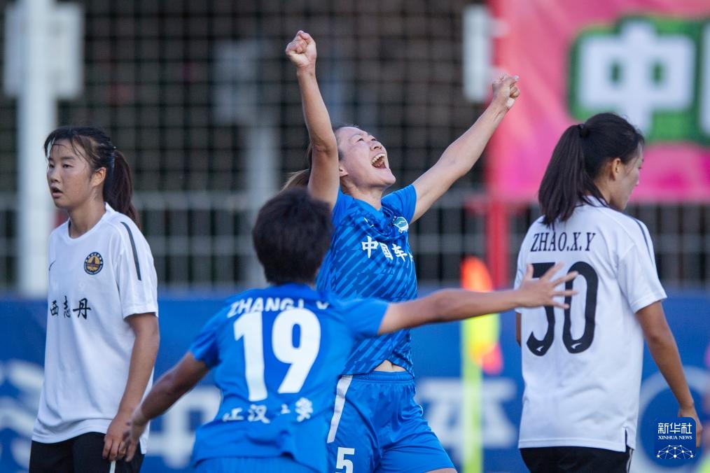 9月28日,武汉车谷江大队球员吴海燕(右二)进球后庆祝。