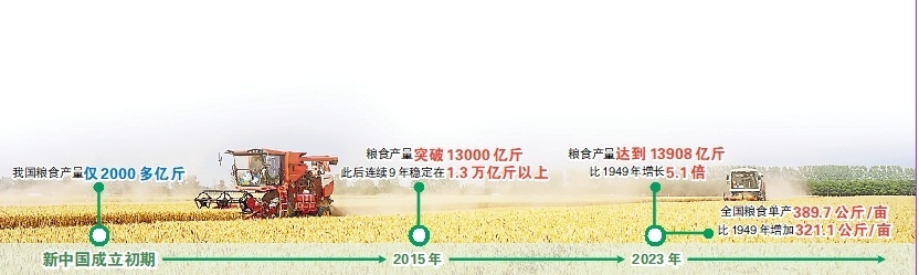 新中国成立初期,我国粮食产量仅2000多亿斤。2015年我国粮食产量突破13000亿斤后连续9年稳定在1.3万亿斤以上,2023年粮食产量比1949年增长5.1倍。