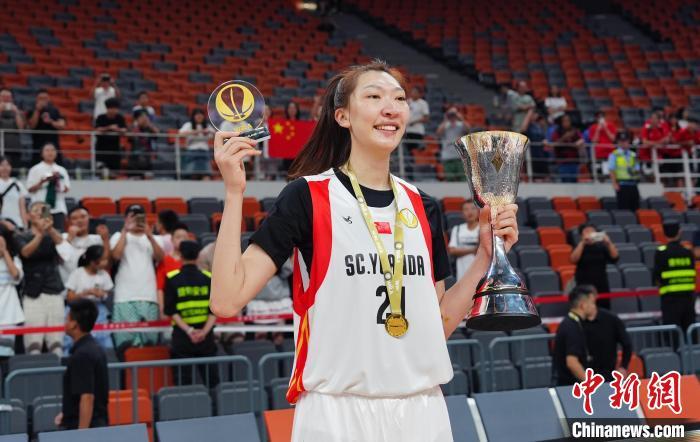 9月28日晚,在成都进行的首届国际篮联亚洲女子篮球联赛,中国四川远达美乐队以74:69战胜日本富士通红浪队,夺得冠军。图为中国四川远达美乐队队员韩旭获得最有价值球员。中新社记者 安源 摄