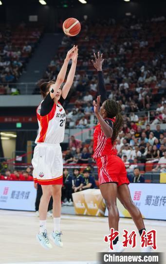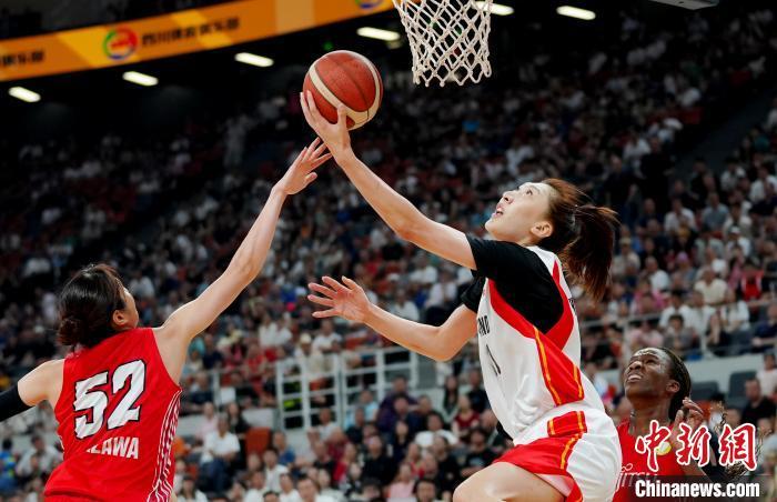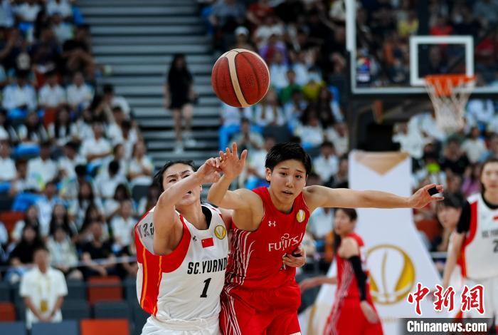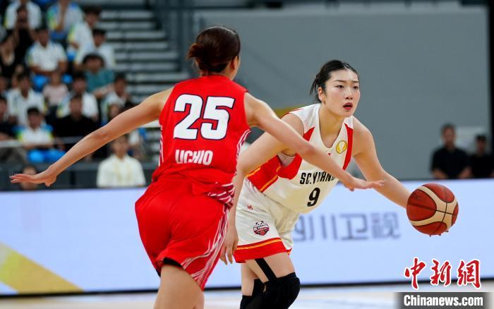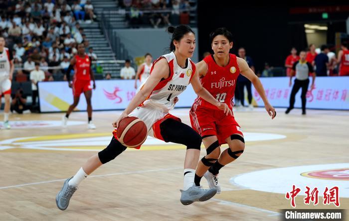 9月28日晚,在成都进行的首届国际篮联亚洲女子篮球联赛,中国四川远达美乐队以74:69战胜日本富士通红浪队,夺得冠军。图为中国四川远达美乐队1号队员王思雨(白衣 左 )在比赛中。中新社记者 安源 摄