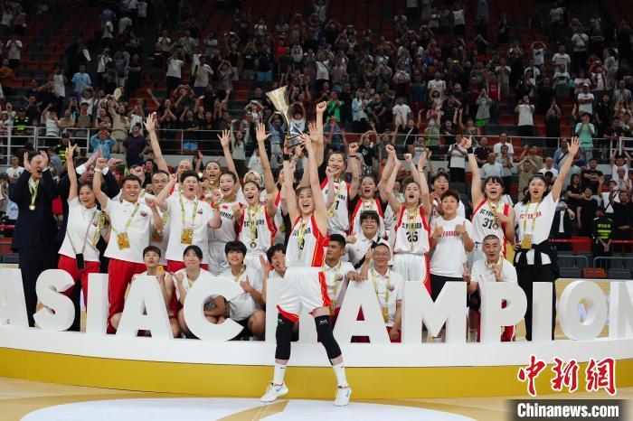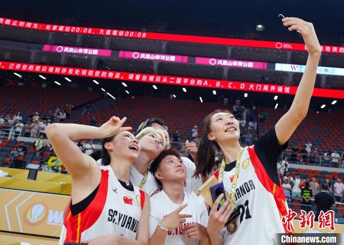 9月28日晚,在成都进行的首届国际篮联亚洲女子篮球联赛,中国四川远达美乐队以74:69战胜日本富士通红浪队,夺得冠军。图为中国四川远达美乐队队员韩旭(右一)比赛结束后和队友拍照留念。中新社记者 安源 摄