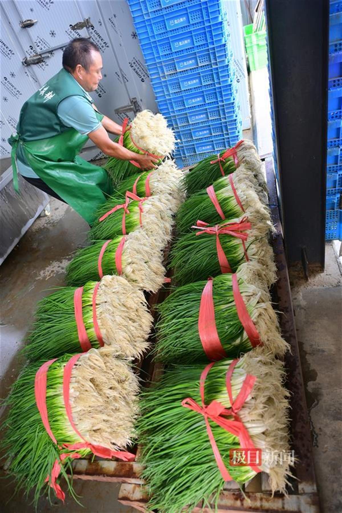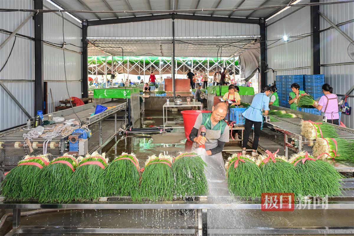 9月28日,湖北省十堰市竹山县亨运天盈农业发展有限公司生产的香葱、香菜、黄瓜经过清洗、过秤、打捆、覆冰装车,加紧运往湖北襄阳、陕西安康等地,满足十一期间市场需求。