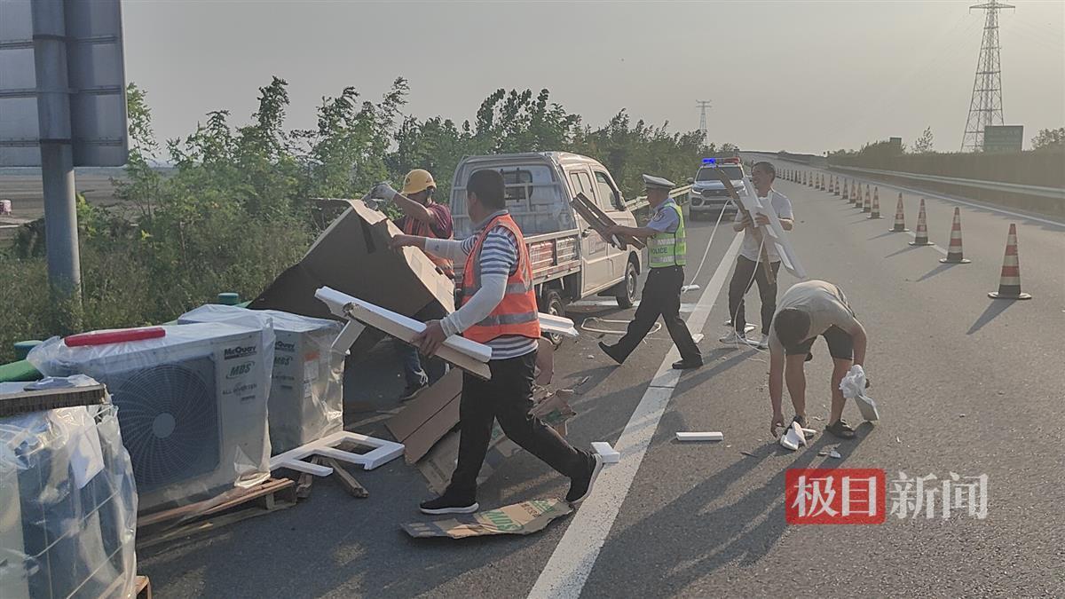 民警快速摆放好锥筒,设置好警戒区,迅速做好安全防护,严防发生二次事故。随即与赶来的高速公路养护人员及货车驾驶人迅速将四台空调外机搬运至应急车道。因车身距护栏很近,不好将车辆扶正,于是合众人之力,奋力将货车向路中央推移一段距离后再将车辆扶正。众人联手又将货物重新装上货车,并将事故车辆转移到随后赶来的施救车上。经过近一个小时的施救,事故现场清理完毕,道路恢复正常通行。