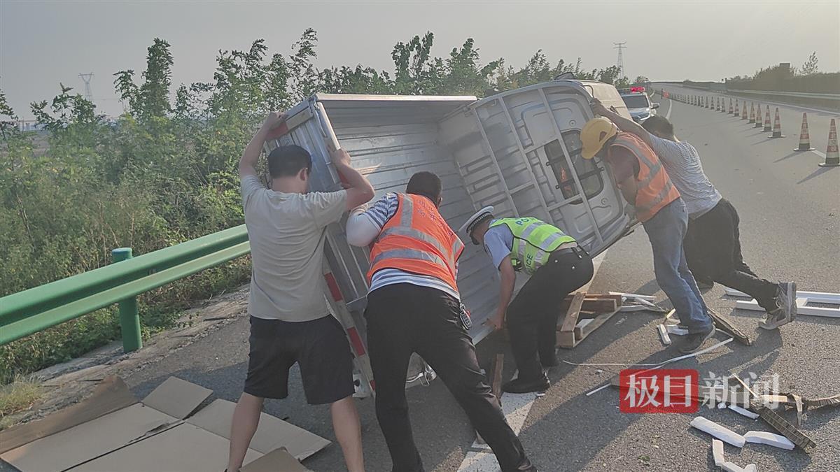9月27日16时15分许,湖北省宜城市公安局交警大队高速中队民警接到报警,麻安高速安麻向289公里+900米处有一辆轻型货车前轮曝胎后发生侧翻,所拉载的货物散落路面,已影响到其他车辆正常通行。接警后,民警迅速赶往现场处置。