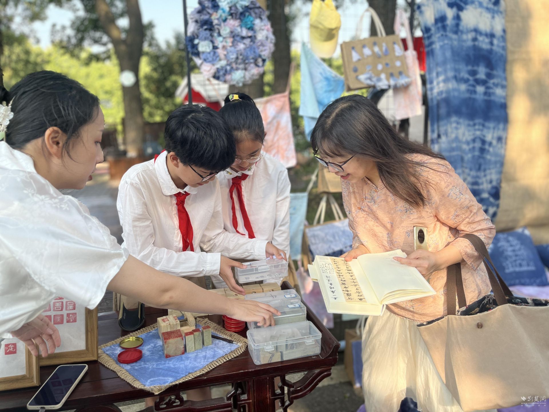 活动现场,新华小学的扎染与篆刻作品展区成为了亮点之一,琳琅满目的学生作品深深吸引了众多嘉宾的目光。这些作品是从众多佳作中精心挑选而出,不仅展示了学生们在扎染与篆刻领域的深厚功底,更体现了新一代少年儿童对传统文化的热爱与创新精神。