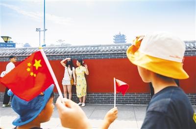 9月30日,游客在武汉司门口红墙前拍摄和黄鹤楼的同框照片。(湖北日报全媒记者 柯皓 摄)