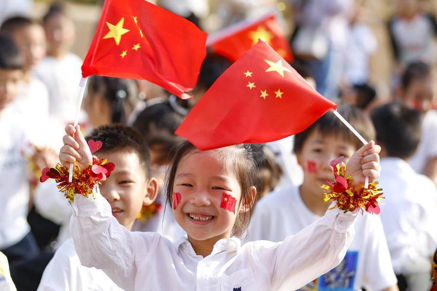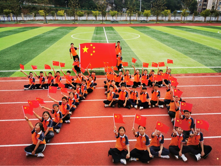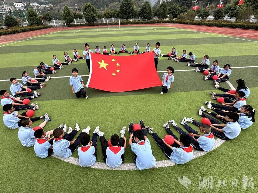 9月28日,竹山县竹坪小学的学生们和国旗合影。(湖北日报客户端竹山频道 通讯员 张云朝 王喜苹 胡斐 周明玉)
