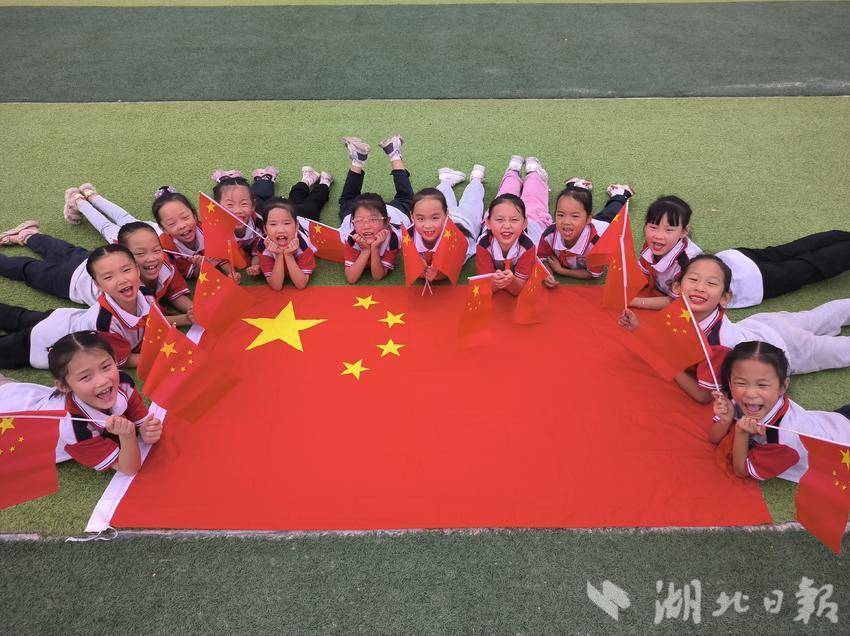 近日,枣阳市平林镇新集小学,学生们与国旗留下合影。每一张笑靥,每一个身影,在国旗的背景下,都显得尤为生动与可爱。(湖北日报客户端枣阳频道 通讯员常明艳 陈倩)