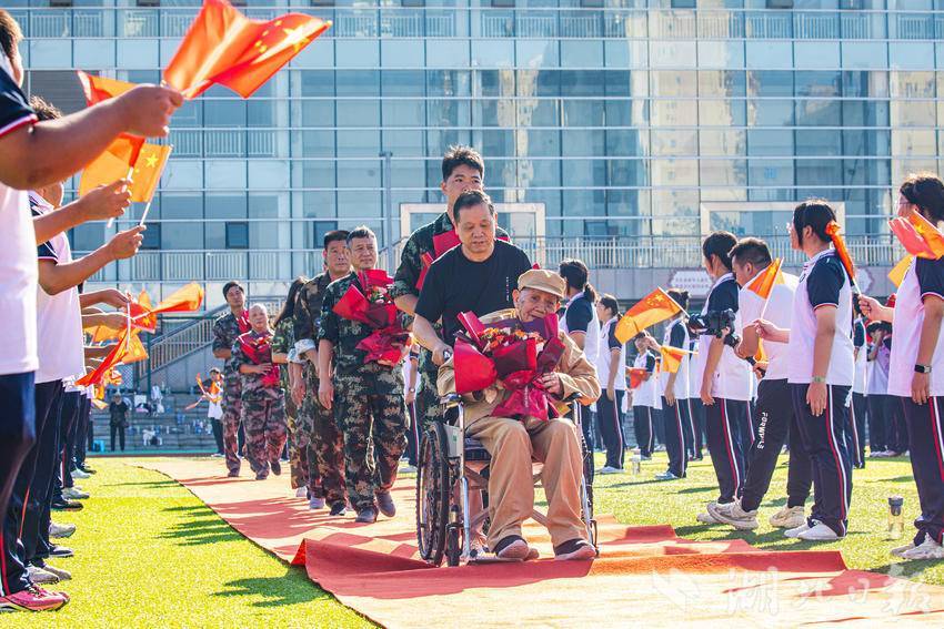 9月29日,黄石市在湖北师范大学附属中学(黄石一中)举行“致敬英雄 礼赞祖国”活动。活动现场通过巨幅国旗、中国地图展示、主题演唱、老兵走红毯、向老兵献花、向老兵赠送《致敬英雄》读本、讲红色故事等方式推进新时代爱国主义教育,让革命精神永相传,营造喜庆的节日氛围。(湖北日报客户端 通讯员 周巍)