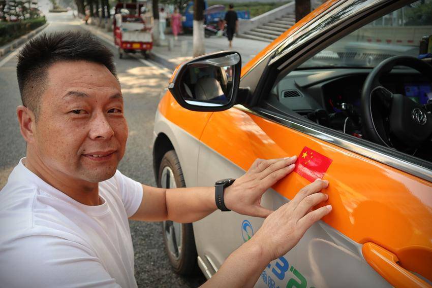 近日,湖北秭归,一位出租车师傅在车身醒目位置贴上了鲜艳的五星红旗,记录下了这张合影。(湖北日报客户端秭归频道 通讯员杨晓东)