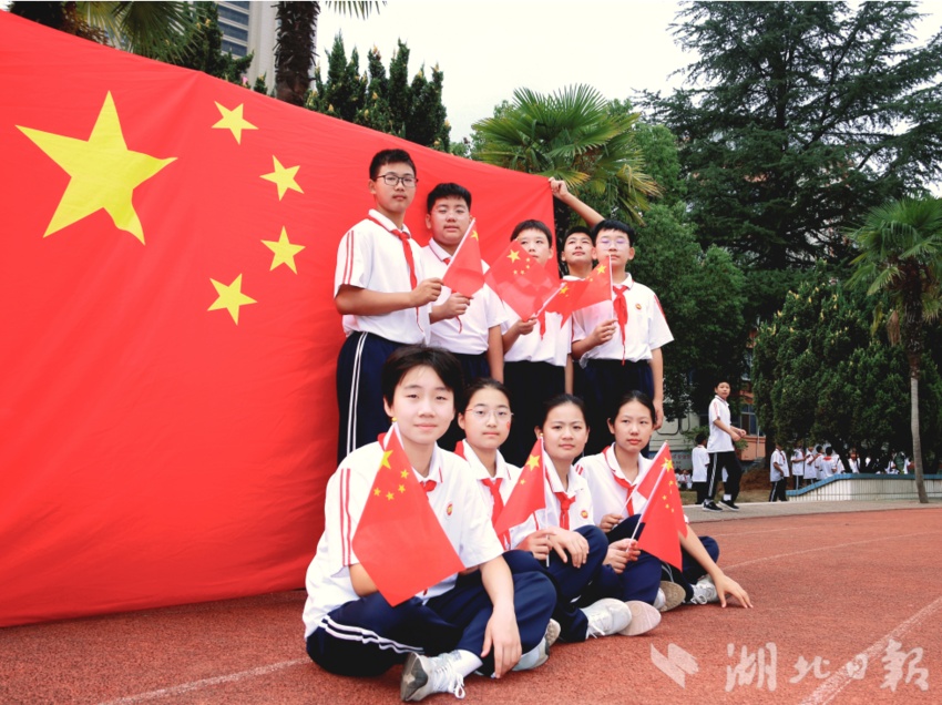 9月29日,阳光明媚,十堰市第十三中学校园洋溢着喜庆氛围。操场上,五星红旗迎风飘扬,格外耀眼。同学们来到国旗前,以灿烂的笑容和挺拔的身姿与五星红旗合影。(湖北日报客户端张湾频道 通讯员闫珊珊 罗静)