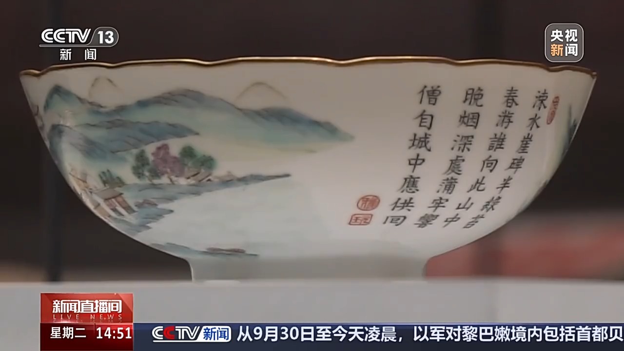 这件清代的粉彩山水诗文瓷碗,就还原了当年康乾钦定“西湖十景”中的南屏晚钟。