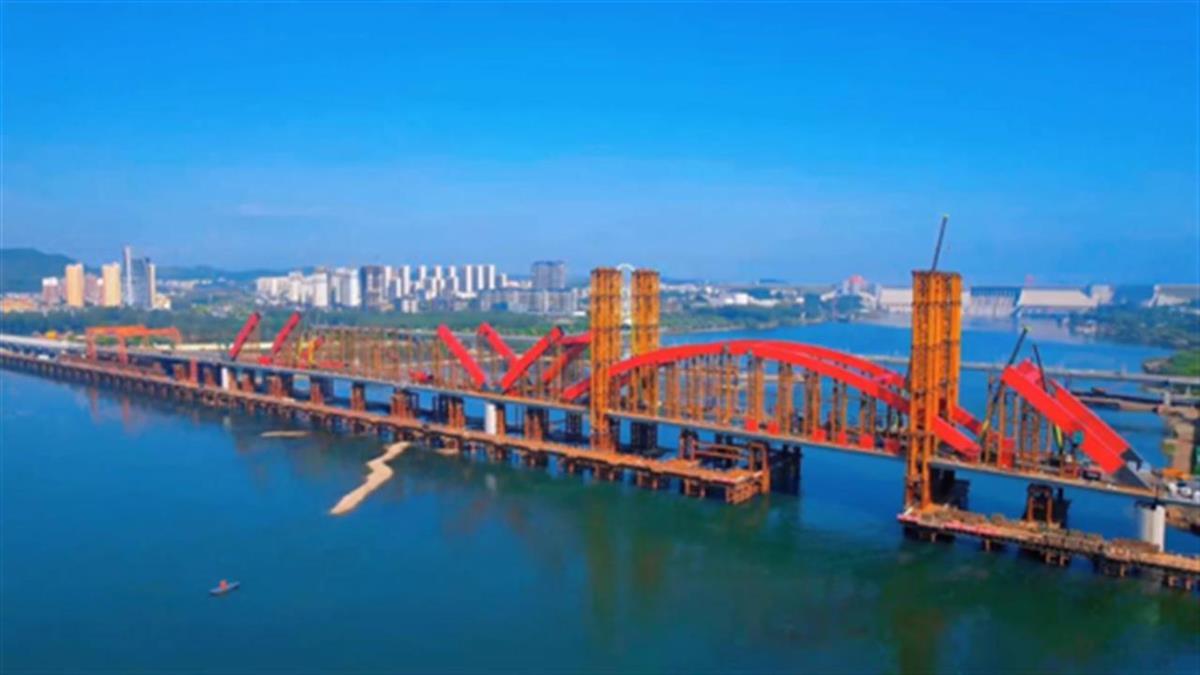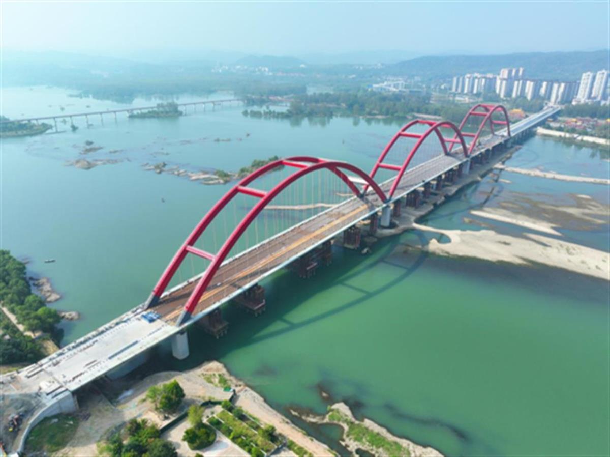 新建的水都二桥项目整体设计有着“长虹卧波”“鳌背连云”的特色,三跨钢拱肋外观均为红色,一桥雄跨汉江,宛如3道彩虹横“卧”在汉江上方。
