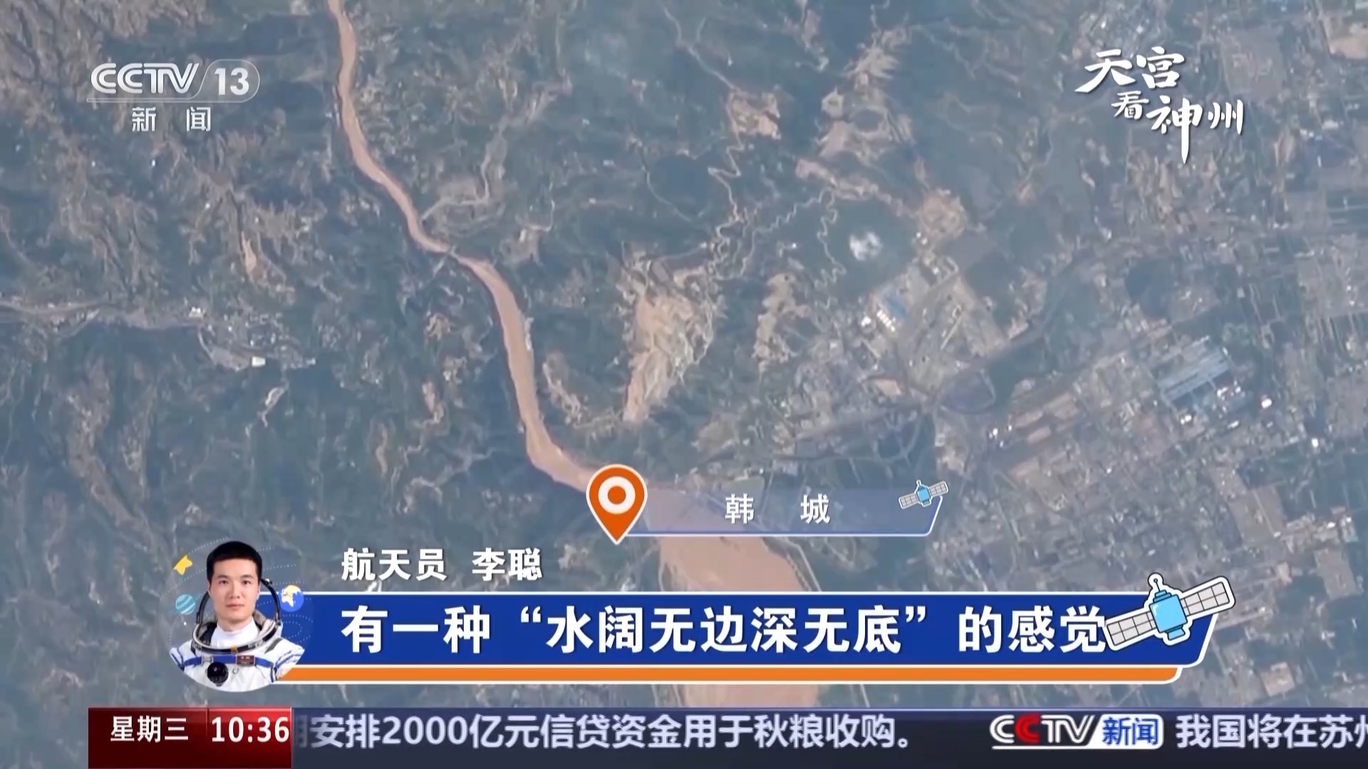 航天员 李聪:现在大家看到的是,黄河流入陕西韩城,也就在这里,黄河突然变得更为宽敞,有一种“水阔无边深无底”的感觉。