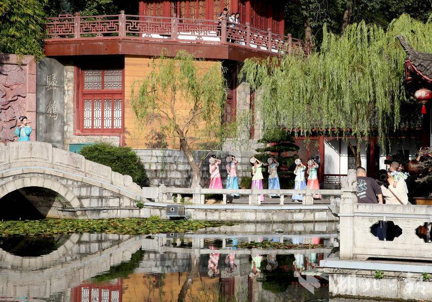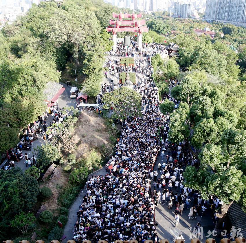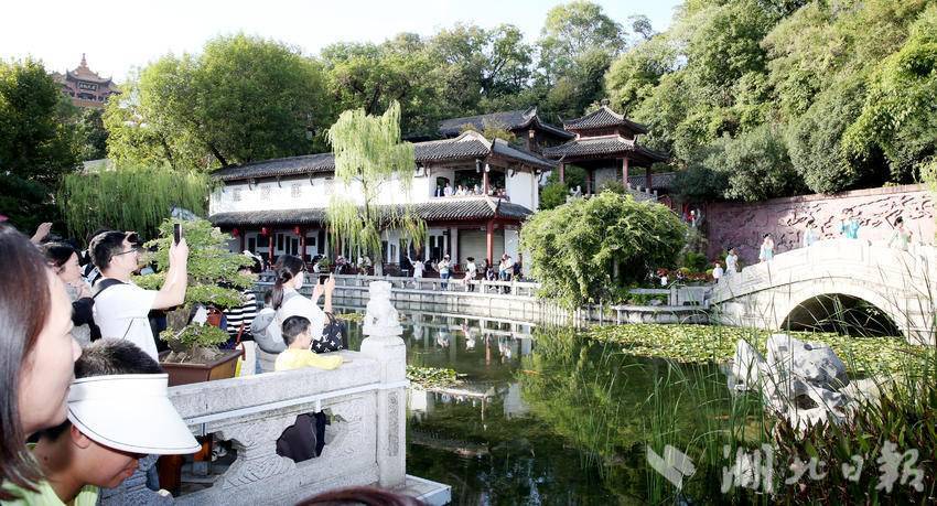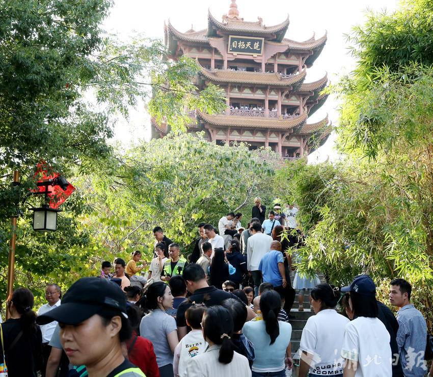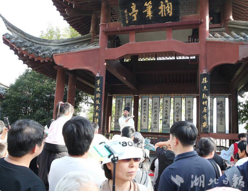 10月2日,游客在黄鹤楼公园观看李白诗会。国庆节日期间,黄鹤楼公园举办《李白诗会》、古装器乐舞蹈《清风弄墨》、《黄鹤楼灯光秀》等丰富多彩的文化活动迎接海内外宾客,当日昼夜接待游客5.6万多人。
