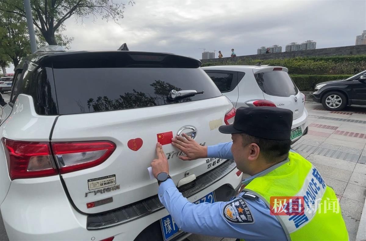 民警为路边车辆贴国旗反光贴(通讯员供图)