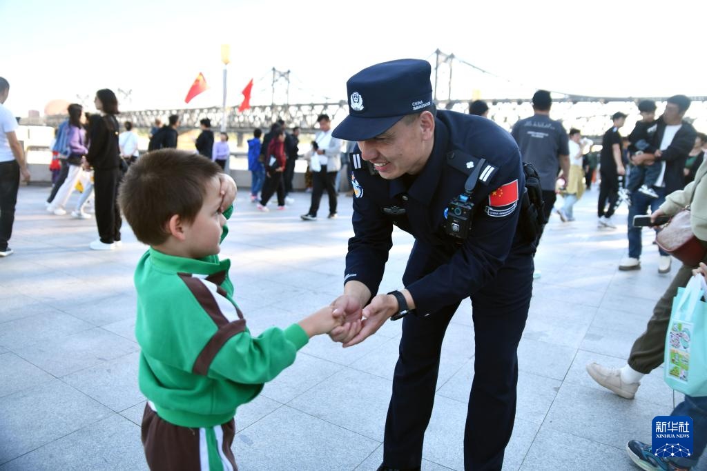 10月3日,丹东边境管理支队一经街边境派出所民警高岩在鸭绿江畔与游客互动。