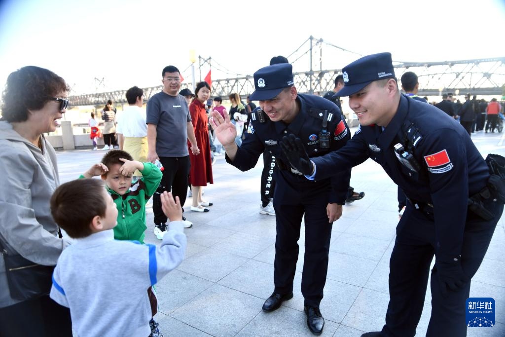 10月3日,丹东边境管理支队一经街边境派出所民警高岩(左),曲宏伟在鸭绿江畔与游客互动。