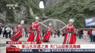 国庆期间,湖南张家界天门山国家森林公园迎来众多游客,大家登山游览,欣赏非遗演出。