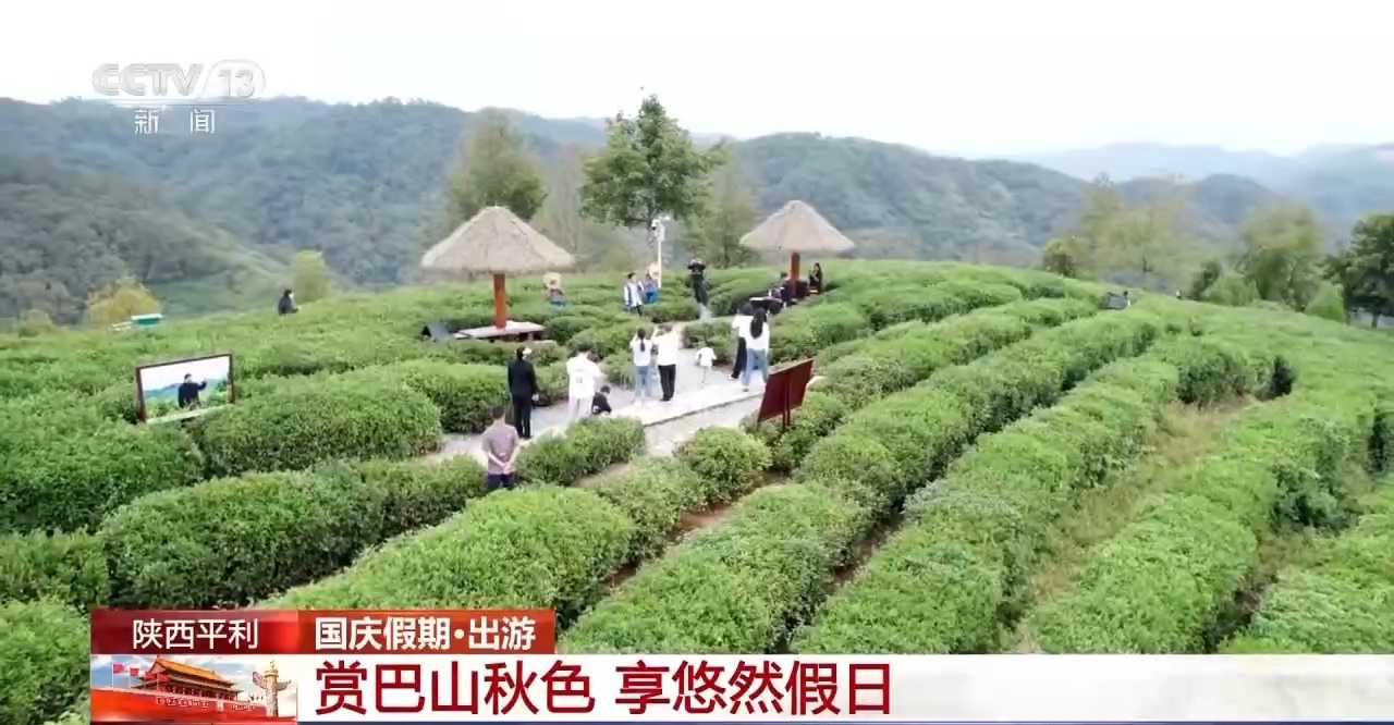 在平利县蒋家坪景区,千亩茶山郁郁葱葱。茶山间休闲游步道、观光看台等设施一应俱全,游客们走走停停,沉醉在漫山的秋色中。