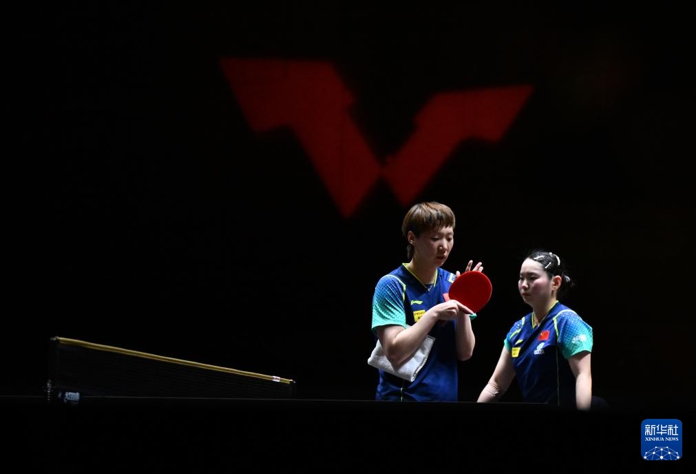 10月4日,王曼昱(左)与何卓佳在比赛间隙。