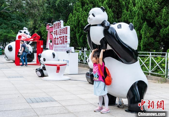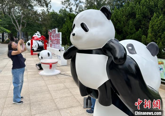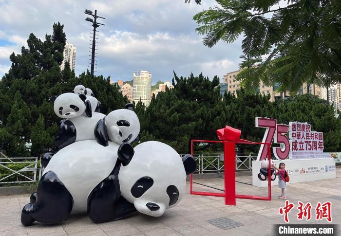 10月5日,香港维多利亚公园一隅摆放的大熊猫雕塑吸引市民在此拍照“打卡”留念。此前,第三对中央赠港大熊猫已顺利抵达并入住香港海洋公园;海洋公园内诞生的一对大熊猫幼崽目前也在健康成长中。中新网记者 侯宇 摄
