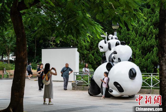 图为大熊猫“亲子”雕塑吸引市民拍照。中新网记者 侯宇 摄