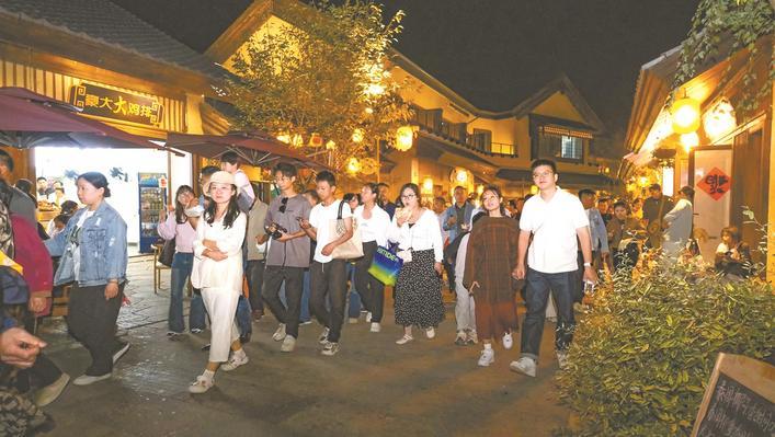 10月4日下午,在问梅村大戏台,楚风民乐、杂技变脸、经典黄梅戏等传统文化演出赢得满堂喝彩;在商业街区,香气四溢的炸串烧烤、滚烫火热的麻辣香锅、色彩缤纷的糖水店铺里烟火气十足;在广场市集上,捏糖人、漆扇、灯笼手作等摊位前的游客络绎不绝,游人不时驻足欣赏,挑选心仪的小物件。