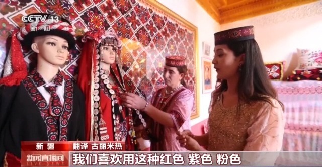 翻译 古丽米热:新娘子身上穿的裙子以及她的大衣上面,全都有塔吉克的绣娘们绣上去的刺绣,一般这些刺绣的图案都来源于生活,比如像山、水、太阳、花草树木,我们都可以以这种抽象化的方式绣到自己的衣服上。这种花边寓意着塔吉克人对美好生活的向往。我们喜欢用红色、紫色、粉色这种艳丽的颜色,跟我们所处的环境形成鲜明对比。
