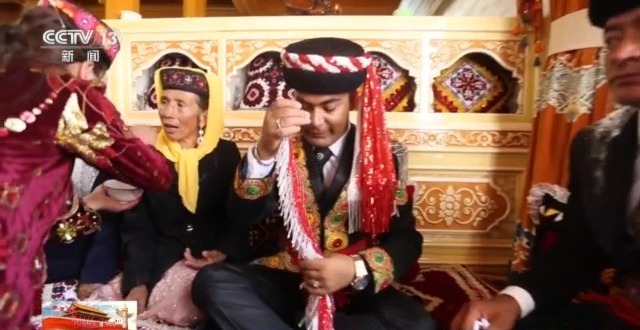 塔县宣传专班工作人员 买尔旦江:新郎头上戴的红色绸布表示红红火火,白色绸布表示白头偕老。撒面粉是最高的祝福。