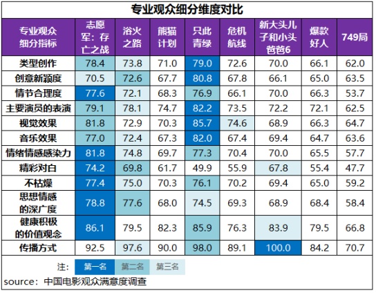 国庆档影片在普通观众、专业观众对于满意度居前两位和后两位的影片满意度评价保持一致,对于满意度中段的四部影片评价则存在差异。
