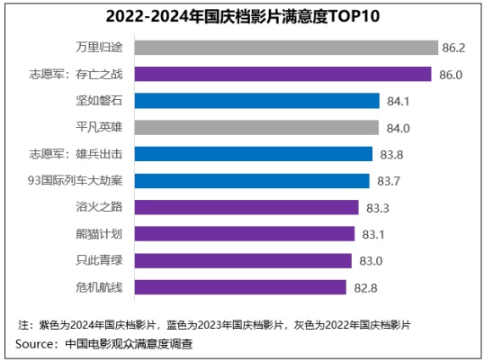 中国电影观众满意度调查・2024年国庆档调查结果显示,国庆档满意度得分83.3分,较去年同期提升0.5分。满意度调查的8部影片中,《志愿军:存亡之战》以86.0分的高满意度居榜首,《浴火之路》《熊猫计划》《只此青绿》三部影片满意度超83分。档期影片汇聚老中青三代导演及演员主创,新片数量众多且题材类型多元,为观众在假期献上了诚意满满的观影大餐。