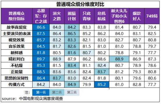 从细分指标评价来看,在普通观众评价体系中,《志愿军:存亡之战》包揽了10项指标中9项的第一位,其中故事喜爱度、视觉效果、正能量和思想深刻性指标都居2024年调查影片首位;《危机航线》传播方式得分居档期首位。此外,《熊猫计划》的故事喜爱度、不枯燥等七项指标,《浴火之路》的思想深刻性,《危机航线》的正能量,以及《新大头儿子和小头爸爸6:迷你大冒险》的精彩对白,都位列档期第二位。