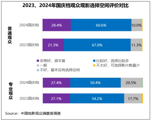 2024年国庆档影片在类型上涵盖喜剧、动作、剧情、动画等常规类型及舞蹈诗剧、冒险奇幻等探索创新性类型,内容题材从历史战争、社会热点,到百姓生活、萌宠,甚至诗剧艺术、超自然等均有涉及,档期观影选择空间评价方面,满意度调查数据显示,2024年国庆档普通观众和专业观众认为档期观影选择空间“非常好、很丰富”的占比分别为28.4%、27.4%,分别同比增长了7.1%、0.3%。