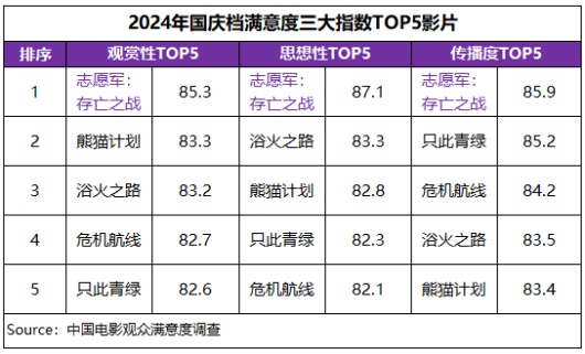 档期满意度三大指数方面,2024年国庆档观赏性得分83.2分,思想性83.9分,传播度82.8分,与2023年同期相比分别增长了0.3分、0.5分和1.0分;其中,思想性得分在2024年调查的5个档期中居第二位。
