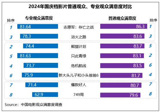 评价趋同方面,满意度居前两位的《志愿军:存亡之战》和《浴火之路》在不同类别观众评价中都分别居第一、第三位,而满意度居后两位的《爆款好人》《749局》则都居第七、第八位。其中《志愿军:存亡之战》获得一致认可,普通观众满意度高于《抓娃娃》,为2024年春节档以后调查影片首位,专业观众满意度为春节档以后调查影片的第四位。