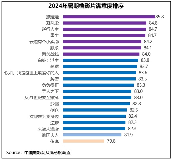 2024年国庆档满意度调查的8部重点影片中有7部获得观众“满意”评价(≥80分),其中有5部满意度超82分、4部超83分,是2022年和2023年国庆档超82分影片的数量之和。与2023年国庆档TOP3影片满意度表现均衡、分差最大仅0.4分相比,2024年国庆档影片满意度“梯队”明显,居第一位的影片满意度超出第二名2.7分,与档期末位影片相差7.4分,都是近三年同期最高。