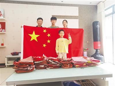 张潮一家四口。茶几上,左为收藏的旧国旗,右为预备用于免费更换的新国旗。