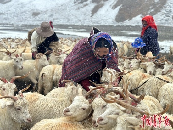 9月13日,西藏阿里地区日土县热帮乡龙门卡村迎来了一场雪。在海拔近4800米的龙门卡村夏季牧场,牧民们把待挤奶的白绒山羊依次用绳子拴起来。中青报·中青网记者 石佳/摄