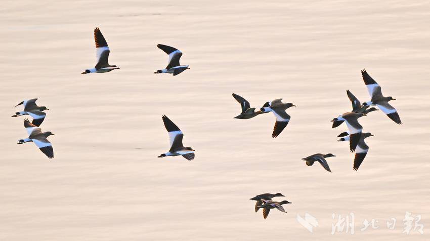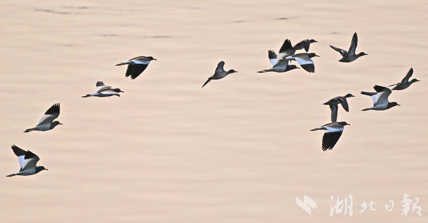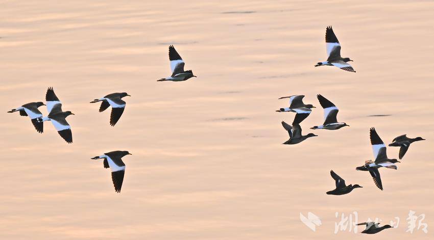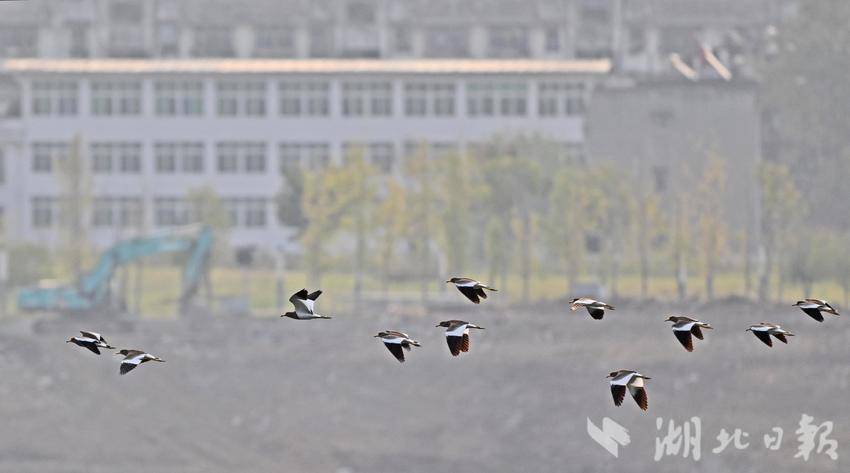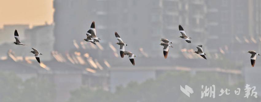 10月8日清晨,灰头麦鸡成群结队出现在长江宜昌城区江段上空。灰头麦鸡属冬候鸟,是国家“三有”保护鸟类,是鸻科、麦鸡属的中型水鸟,已被列入《国家保护的有益的或者有重要经济、科学研究价值的陆生野生动物名录》和《世界自然保护联盟濒危物种红色名录(IUCN)》。近年来,宜昌持续加大长江生态环境的保护力度,国家保护动物在此栖息已成常态。(湖北日报全媒记者 刘曙松 摄)