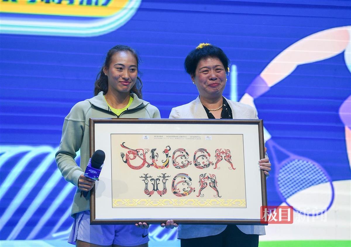 两位郑钦文的球迷来到舞台上,将鲜花送给了郑钦文。湖北省体育局网球中心主任黄艳红为郑钦文送上了精心准备的生日礼物:一幅绣着“Queen Wen”字样的楚绣,这是一幅具有湖北特色的作品。拿到礼物的郑钦文笑着说道:“我非常喜欢这个礼物,完全感受到了家乡人民的热情。”