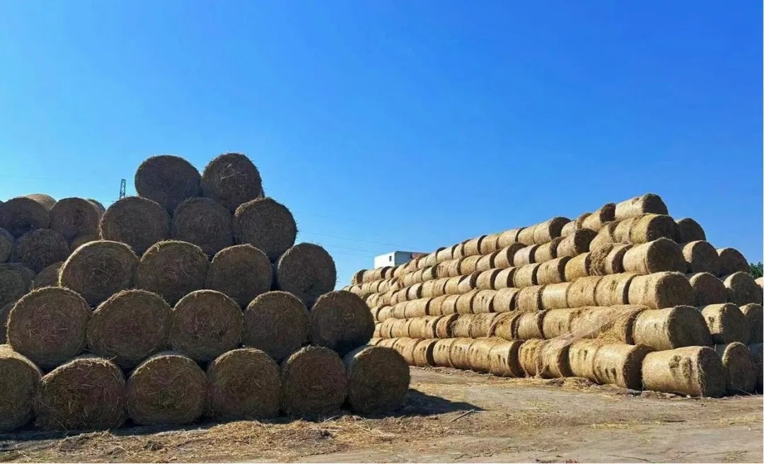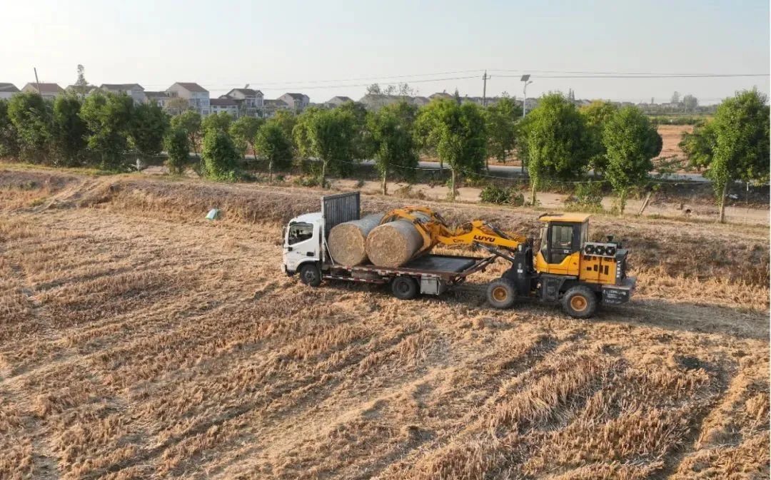 秸秆打捆机穿梭于田间地头,将收割的秸秆打捆回收再利用。随着机器驶过,地里散落的秸秆被收进机器。巨大的圆柱形草捆从机器中吐出,井然有序地堆放于田间。之后,这些草捆会被运送到镇集中收储点,再转运变为生物质燃料和生物质发电的原料。