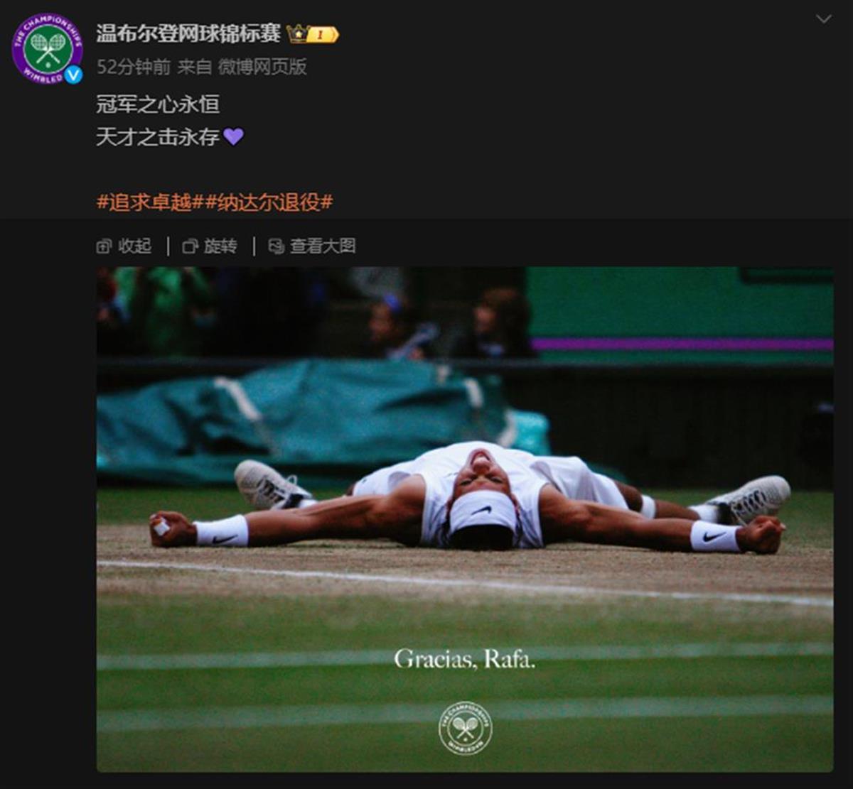 温网官方还特别发布了长达6小时的视频,那是纳达尔与费德勒在温网上的一场对决,并留言:他们说,这是温网历史最经典的男单决赛。
