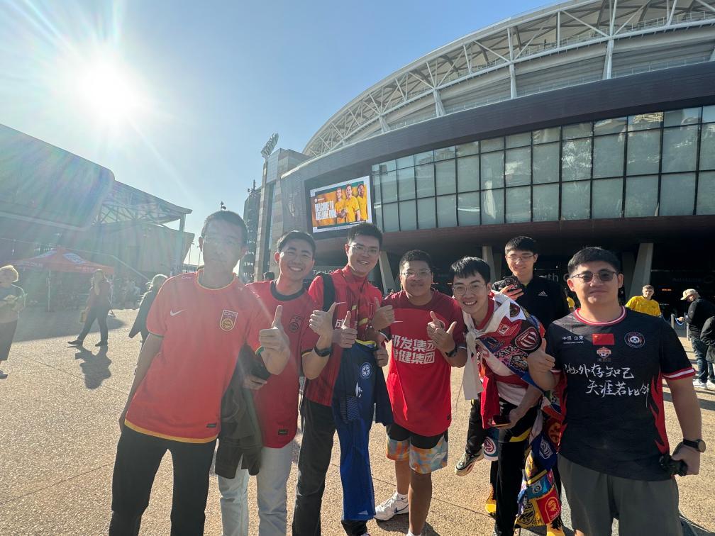 遥远又昂贵的旅程,加上复杂的签证手续,让太多的中国球迷无法从国内赶来现场观赛。但比赛开始前三个小时,就有大量身穿红色球衣的中国队球迷聚集在赛场外,不时喊着口号为中国队加油,他们大多是从澳大利亚各地赶来的华人和留学生。